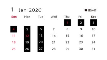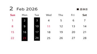 これまで毎週月曜日および第1・2・3火曜日を定休日としておりましたが、2026年1月から毎週月曜日・火曜日を定休日とさせていただくことになりました。